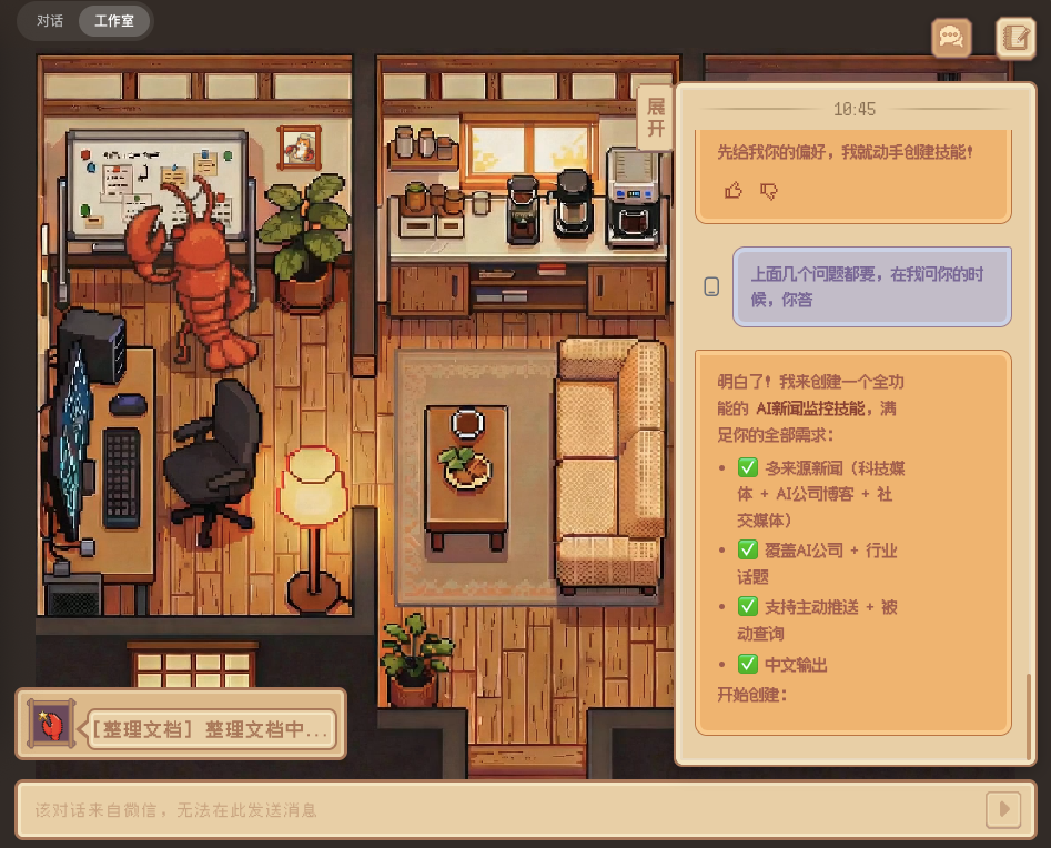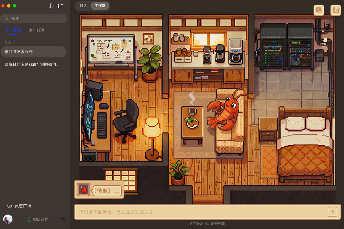 In this V0.1.9 update, QClaw introduced a UI design with real warmth—“Lobster Studio.” It’s a cozy, pixel-art cabin where users can literally watch the lobster typing at a keyboard and looking at a whiteboard.